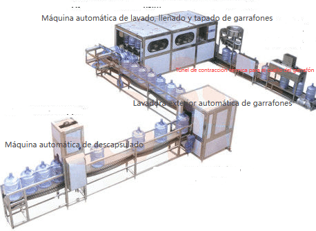 La línea completa de llenado de garrafones de 5 galones incluye opcionalmente los siguientes equipos: Máquina descapsuladora (extracción de tapas), Máquina de detección de fugas