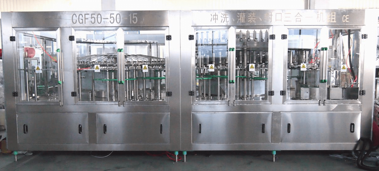 La máquina de llenado de botellas 24000 BPH 50-50-15 integra las funciones de lavado, llenado y tapado en un solo equipo. Realiza la automatización completa de todo el proceso y es adecuada para el llenado de botellas de poliéster (PET) y botellas de plástico con agua mineral y agua purificada.