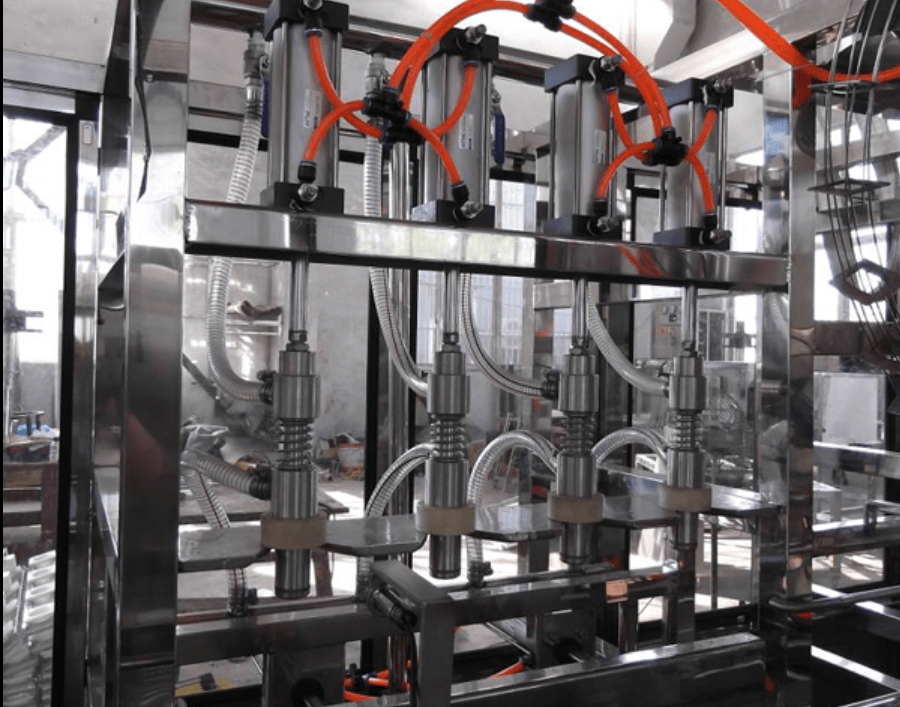 Después del lavado, las botellas pasan al llenador. El cilindro empuja las botellas hacia el llenador, y las boquillas de llenado bajan para llenar las botellas con agua.
