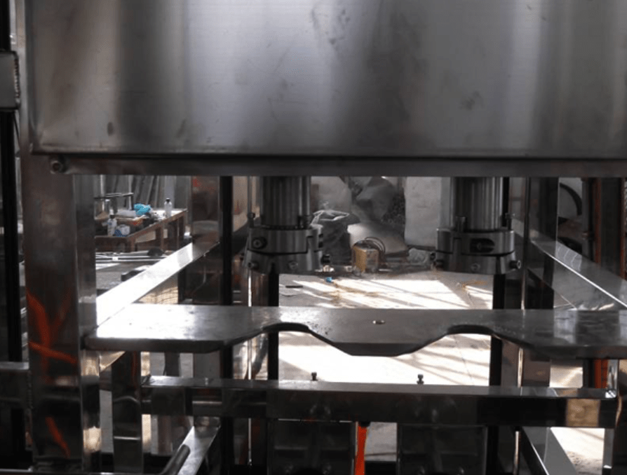 Cuando las botellas llegan a las cabezas de lavado, un cilindro las empuja hacia las cabezas de lavado, que invierten las botellas. Luego, una bomba genera presión y las cabezas de lavado rocían agua para limpiar el interior de las botellas.